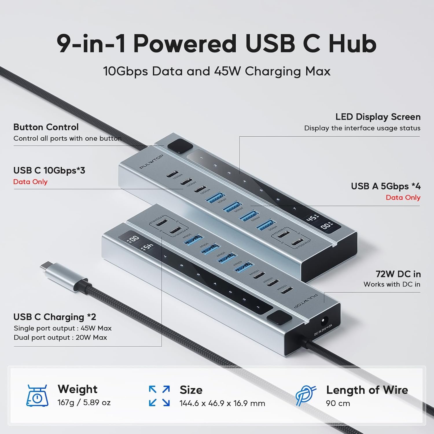 Powered USB C Hub, PULWTOP 9-in-1 USB-Hub suppprt 10Gbps & PD 45W Max Charging(Not Support Video), USB Powered Hub with 3 USB-C, 4 USB-A for Laptop, MacBook, iPad and More (72W Adapter Included)